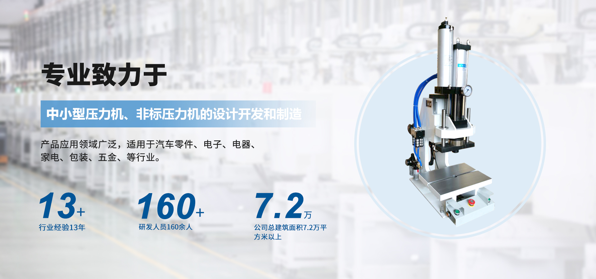 煙臺(tái)壟鑫沖壓設(shè)備有限公司是集經(jīng)營(yíng)、生產(chǎn)、技術(shù)開(kāi)發(fā)為一體的經(jīng)濟(jì)實(shí)體,專業(yè)致力于中小型壓力機(jī)、非標(biāo)壓力機(jī)的設(shè)計(jì)開(kāi)發(fā)和制造。在引進(jìn)德國(guó)、日本等國(guó)家先進(jìn)的鉚壓控制技術(shù)及機(jī)器設(shè)計(jì)理念的基礎(chǔ)上,結(jié)合相關(guān)行業(yè)的實(shí)際需要,開(kāi)發(fā)出各種臺(tái)式、落地式氣動(dòng)壓力機(jī)、手動(dòng)壓力機(jī)、氣液增壓機(jī)、氣液增力缸、旋鉚機(jī)、無(wú)鉚釘鉚接機(jī)等鉚接設(shè)備。產(chǎn)品應(yīng)用領(lǐng)域廣泛,適用于汽車零件、電子、電器、家電、包裝、五金、等行業(yè)。公司視質(zhì)量為生命,并一貫遵循對(duì)每一臺(tái)產(chǎn)品負(fù)責(zé),對(duì)每一位用戶負(fù)責(zé),真誠(chéng)為您服務(wù)。